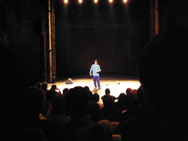 當晚的節目有六組完全不同風格的表演組成,至今印象還很深刻:有一段說書人的表演,他躺在大提琴上說故事,和提琴的旋律、節奏唱和秀口技,超屌。還有玩意識形態的表演,藝術家在非常非常大的畫布上創作,苦無靈感之際,嘗試用身體上任何一個部位去挑戰極限,最後走火入魔了,整個人跳進裝滿墨汁的缸子裡喝墨汁,他和另一個負責吹saxophoe兼敲木琴的夥伴表演,從一開始的荒謬爆笑到結局的淒涼悲哀,力道之強,讓全場觀眾為之沸騰。